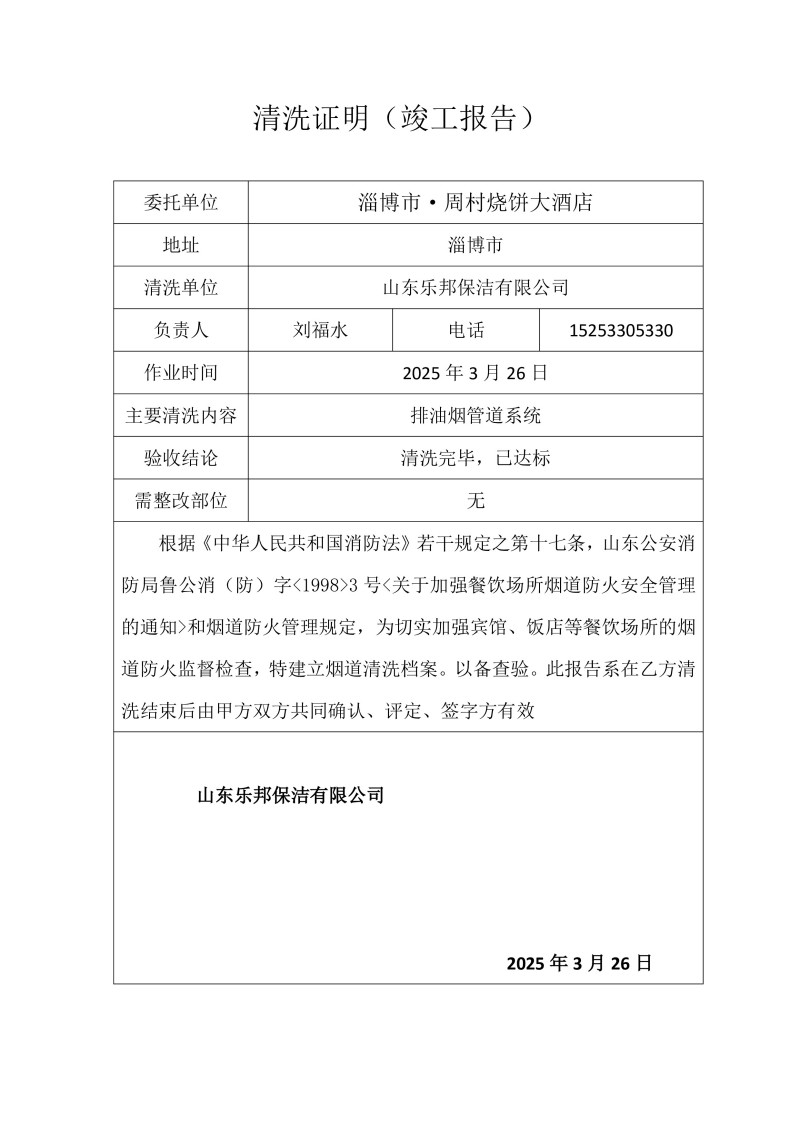 淄博市·周村燒餅大酒店清洗報告25.3.26