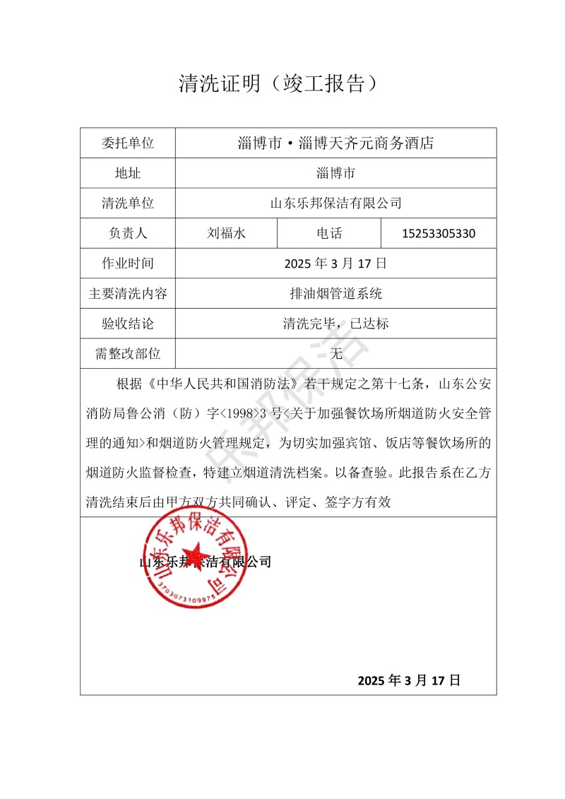 淄博市·淄博天齊元商務(wù)酒店清洗報告25.3.17