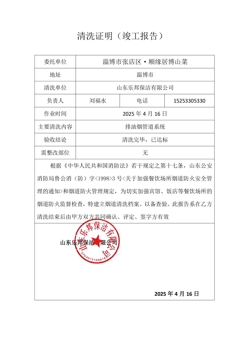 淄博市·淄博天齊元商務酒店清洗報告25.3.17